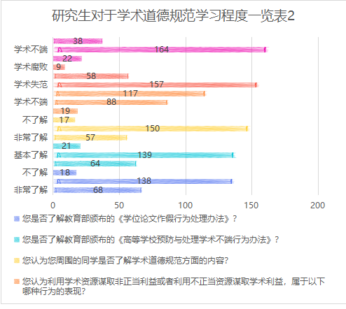 之后,同学们自行学习了《高等学校预防与处理学术不端行为办法》、《学位论文作假行为处理办法》相关文件,并填写了相关调查问卷。此次学术道德问卷调查可以看出,大多数同学读研的目的是为了致力于科学研究,同时也兼顾找工作的需要。同学对学术道德规范和学术道德失范都有基本的了解,并认为学术道德规范对研究生来讲非常重要,对学术不端的行为能够做出正确的判断。
