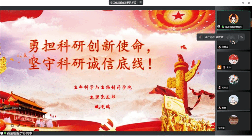 生理党支部宣传委员臧凌鹤老师以“勇担科研创新使命,坚守科研诚信底线”为题,分享了习近平总书记关于新时代科技创新的重要论述、科技发展在国家发展中的重大作用,并介绍了目前国家在抗疫斗争方面应用的诸多科技创新成果以及365官网潜心科研创新、深耕育人理念的优秀教师榜样。同时臧凌鹤老师讲述了科研诚信是科研创新的基石和前提,提醒师生党员要时刻警惕科研诚信的红线,坚守科研诚信的底线,号召全体师生党员在未来的科研工作中,要勇于担当科研创新使命,为建设科技创新型国家贡献自己的力量。