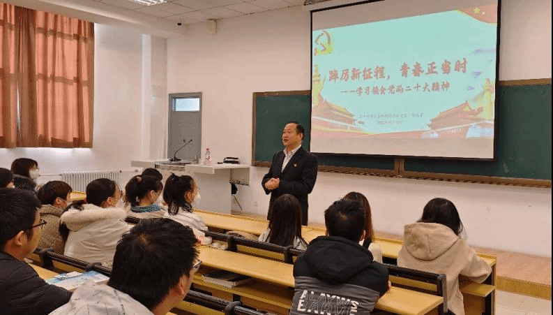 学院党委为了进一步学习宣传贯彻党的二十大精神,切实引导全院师生把思想、认识和行动统一到学习、宣传、贯彻党的二十大精神上来,坚定理想信念,坚守精神高地,筑牢信念之基,学院党员领导干部带头讲授“踔厉新征程,青春正当时”学习二十大精神系列党课、团课,带领广大教师学生深入学习宣传贯彻党的二十大精神。