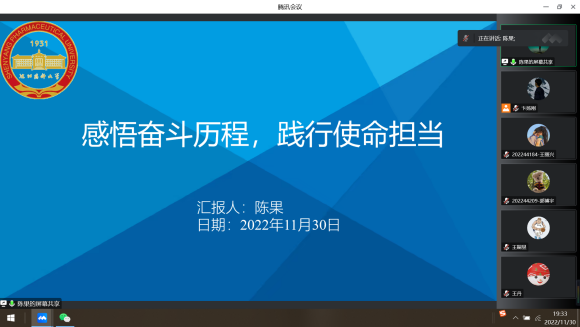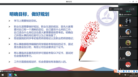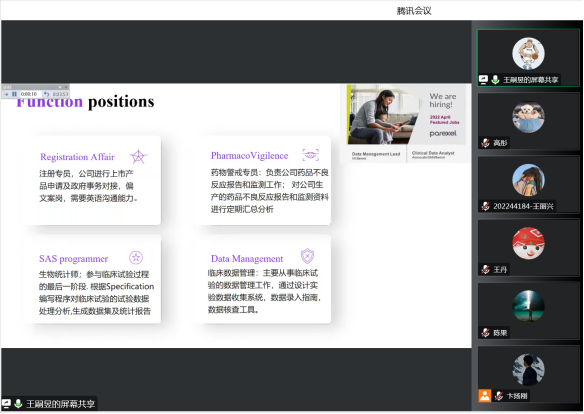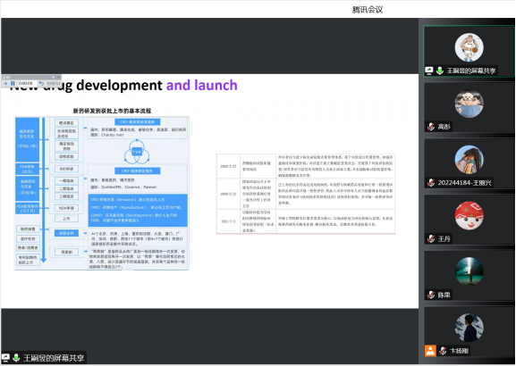 第二位分享者为365官网2022届毕业生校友王嗣昱,在校期间为2019级药理学硕士。曾担任365官网2019级研究生党支部书记,曾获辽宁省优秀毕业生、校级优秀研究生干部等荣誉称号,目前任职于强生公司。校友王嗣昱从读研生活、职业规划、工作之后的心路历程分享了他的感受。他通过讲解新药研发到上市的基本流程,并结合自己目前的工作经历介绍了新药研发相关岗位具体情况,为支部党员们带来了真实、接地气的药学信息,他同时鼓励同学们在科研中要勇于探索,努力创新,在疫情校园封闭管理期间,要把学习生活安排好、发挥学生党员的示范引领作用,切实肩负起学习宣传贯彻党的二十大精神的重大责任,在学习、工作、落实上做表率。