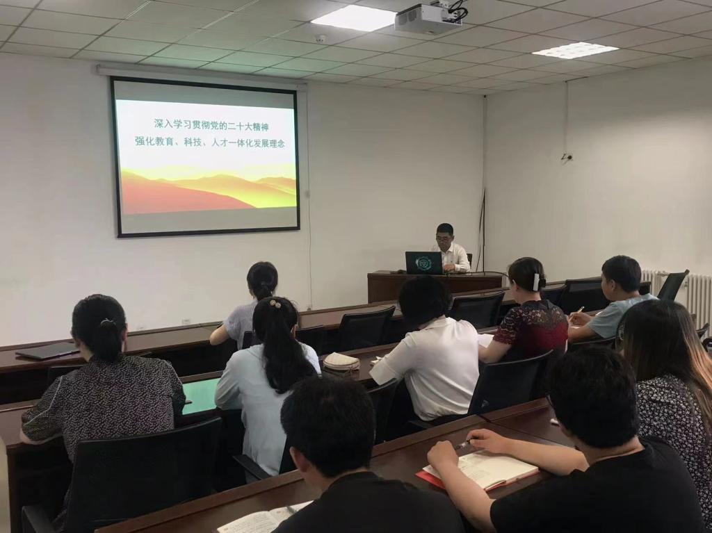夏焕章院长领学了党的二十大报告中关于“教育、科技、人才是全面建设社会主义现代化国家的基础性、战略性支撑”内容。高校作为科技第一生产力、人才第一资源和创新第一动力结合点、交汇处,既是国家创新体系的重要组成部分,同时又担负着为党育人、为国育才、培养社会主义事业建设者和接班人的根本任务。党员教师要主动承担起推动强化教育、科技、人才一体化发展的历史使命和光荣职责,赓续红色血脉、传承红色基因,努力打造一流专业、一流课程,提高人才培养质量。夏焕章强调,要自觉履行高水平科技自立自强的使命担当,认真学习《辽宁全面振兴新突破三年行动方案》,积极推动生物医药产业发展,为生物医药产业做大做强提供技术支撑和人才保障。深入推进产教学研深度融合发展,持续强化创新驱动发展理念,一方面积极争取国家、省市的科研资源推动科研平台建设、科研技术迭代突破、交叉学科快速成长,另一方面加强与企业科研院所沟通交流,以需求为导向,加强科教、产教、产学多方面互相促进、互相扶持。要注重师德师风建设,不断提升个人能力,凝心聚力,用实际行动助力学院高质量发展。