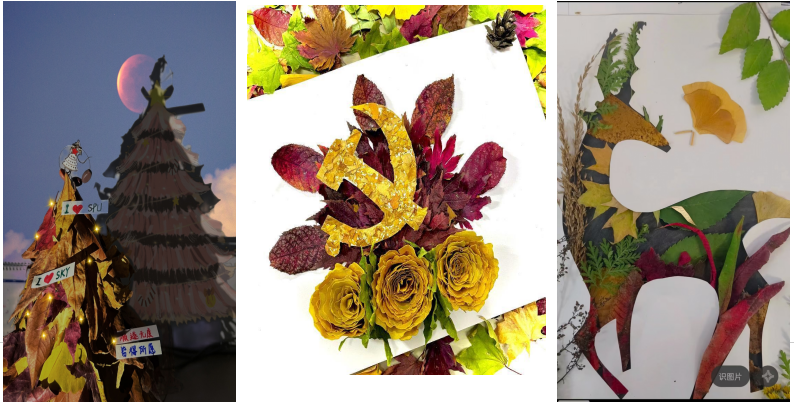 同学们通过编制银杏叶花束、创作小动物、绘制党徽等表达了对生活与祖国的热爱,展现了同学们的心灵手巧,寄托了真挚的祝福和美好的祝愿。
