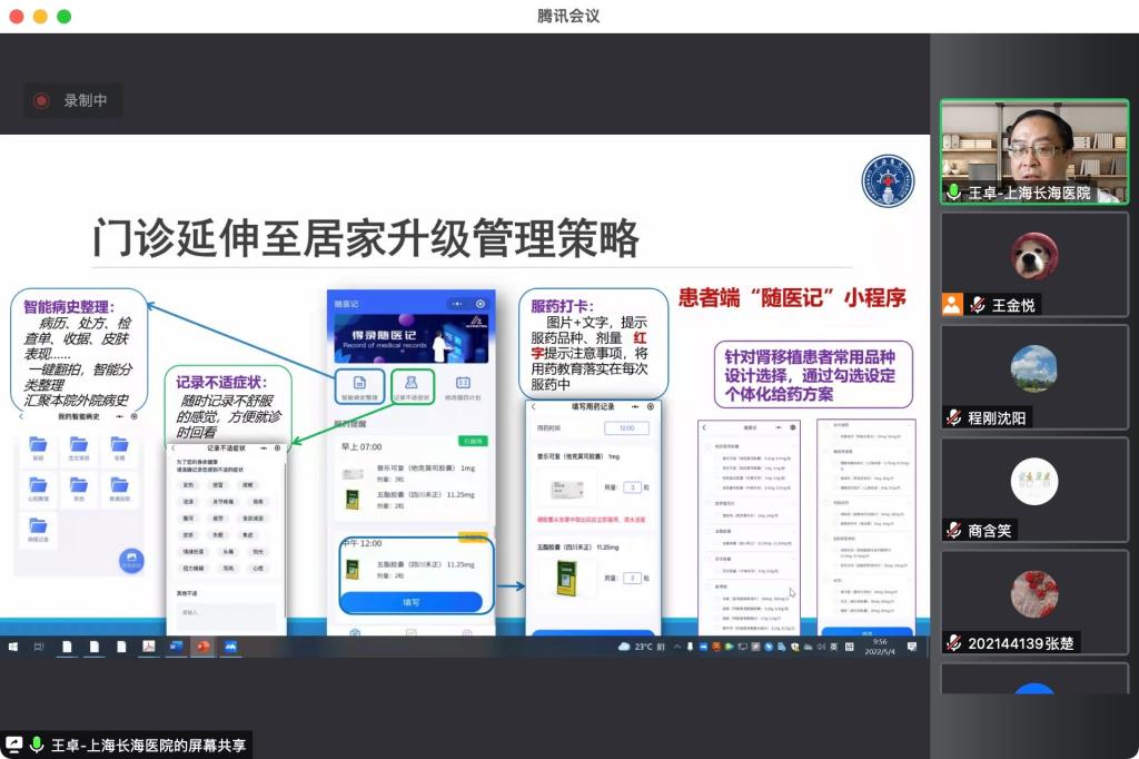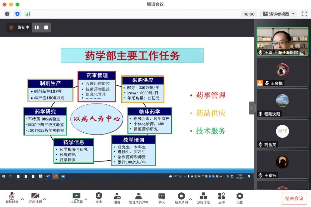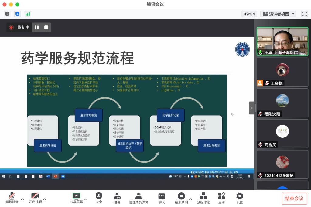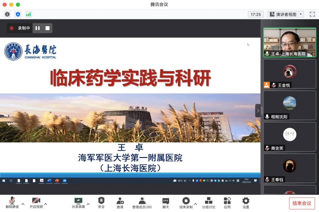 王卓博士作为海军军医大学第一附属医院(上海长海医院)药学部主任,同样也是365官网临床药学专业的兼职导师,对于医院的药师工作具有丰富的经验和体会。本次会议王卓博士结合本人工作和教学经历,以“临床药学实践与科研”为题,首先介绍了医院药学部的主要任务,包括药事管理、药品供应、技术服务三大方面,讨论了临床药师及其本职工作的内涵;其次详细描述了药学服务规范流程、药物治疗管理的实施流程,以及临床药学信息系统的应用,探讨了药师的临床实践及规范化建设的内容和意义;最后以本课题组开展的科研工作为例,与同学们共同交流临床药师该如何做好科研选题和科研工作。最后,王卓博士与参会师生就依靠医院数据进行真实世界研究等具体问题及药学服务等研究领域的前沿动态进行了热烈讨论与交流。