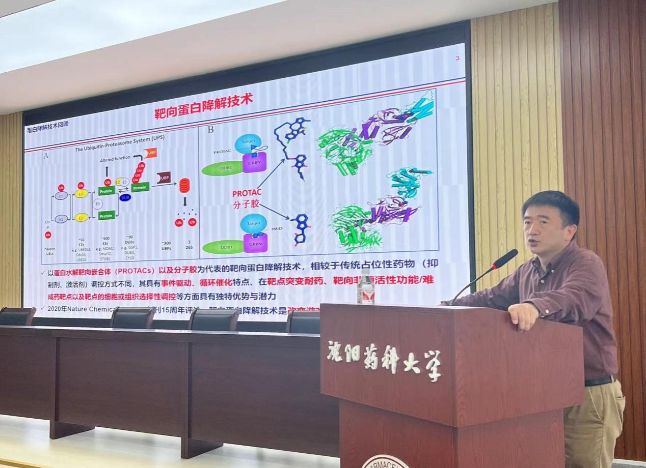 李佳教授作为现任中国科学院上海药物研究所所长、中科中山药物创新研究院院长、中科环渤海药物高等研究院院长,具有多年的工作经验和科研经历。李佳教授结合课题组与自身科研经历,以“靶向蛋白降解布局思考、先导化合物发现和新药研发实践”为题,从靶向蛋白降解的策略与机制出发,深入探讨了这一领域在药物设计中的重要性和潜在应用,并讲述了如何从大量候选分子中筛选出具有潜力的先导化合物,以及对其进行结构优化以提高药效和安全性;随后对靶向蛋白降解技术在新药研发中的未来潜力和前景进行了展望,探讨了可能的研究方向和技术创新。最后,李佳教授与参会师生就如何对先导化合物进行结构优化以提高药效与生物利用度等要点问题进行了热烈的讨论与交流,在药理学相关领域拓宽了365官网师生的研究思路。